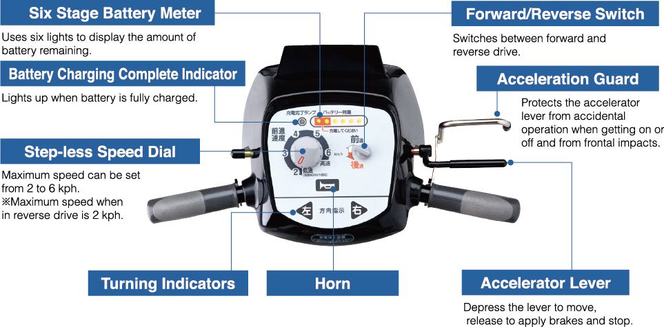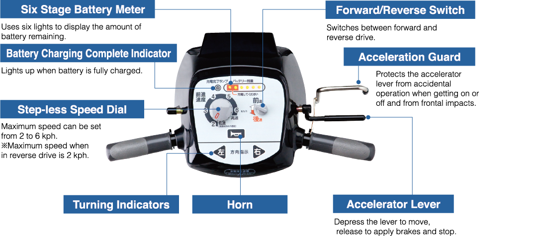 Equipped with internal microcomputer controlled fast charger or use with residential AC 100 V (charges new battery to 100% in six hours) |